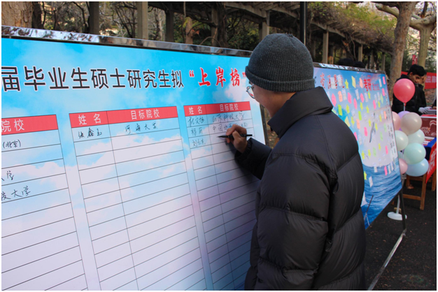 考研学子在“拟上岸榜”中郑重写下姓名与理想院校。考研学生杜文旭表示:一笔落下,是目标,也是激励,相信一战之后,我们必将抵达。(文:臧宇轩 图:杨志浩 张慧臻)