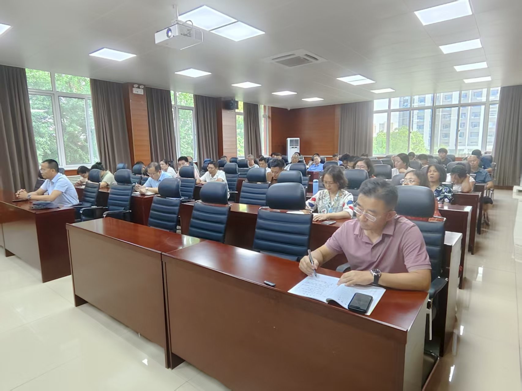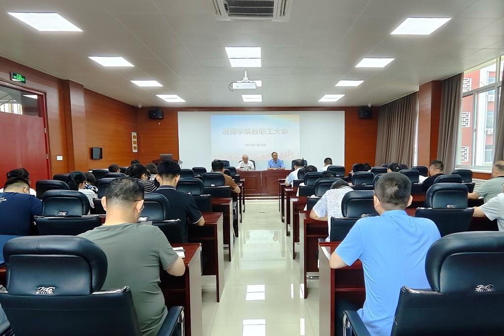 7月18日,资源学院在2号楼201会议室召开全体教职工大会,总结上学期工作,部署暑期及新学期重点工作。会议由校区领导贾宏俊、学院党委书记高尚宇主持,全体教职工参加。
